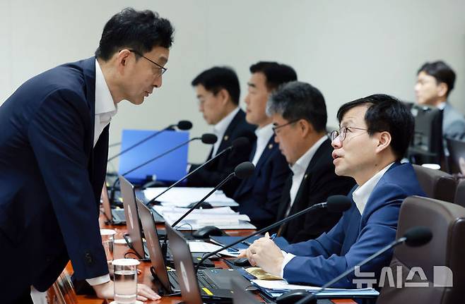 [서울=뉴시스] 최동준 기자 = 윤창렬(왼쪽) 국무조정실장과 여한구 통상교섭본부장이 15일 서울 용산 대통령실 청사에서 열린 국무회의에서 대화하고 있다. (대통령실통신사진기자단) 2025.07.15. photocdj@newsis.com