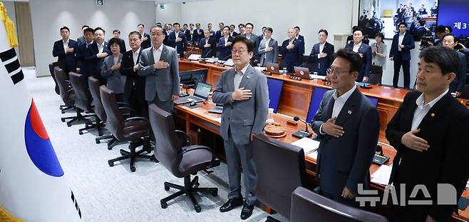 [서울=뉴시스] 최동준 기자 = 이재명 대통령과 김민석 국무총리를 비롯한 참석자들이 15일 서울 용산 대통령실 청사에서 열린 국무회의에서 국민의례를 하고 있다. (대통령실통신사진기자단) 2025.07.15. photocdj@newsis.com