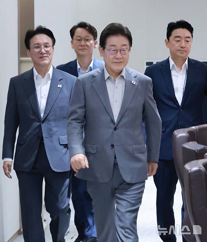 [서울=뉴시스] 최동준 기자 = 이재명 대통령이 15일 서울 용산 대통령실 청사에서 열린 국무회의에 입장하고 있다. (대통령실통신사진기자단) 2025.07.15. photocdj@newsis.com