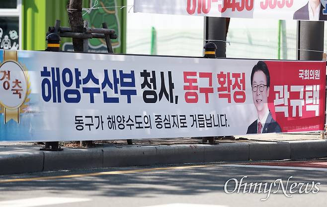 | ▲ '동구 임시청사 마련' 등 이재명 대통령이 대선공약인 해양수산부 부산 이전 추진 속도전에 나서자 14일 국민의힘 곽규택(부산 서동구) 국회의원과 부산 동구청이 환영 현수막을 곳곳에 내걸었다. |