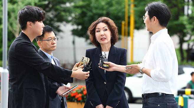 ▲ 이진숙 사회부총리 겸 교육부 장관 후보자가 30일 오전 서울 여의도 한국교육시설안전원에 마련된 인사청문회 준비 사무실로 출근하며 취재진과 질의응답하고 있다.