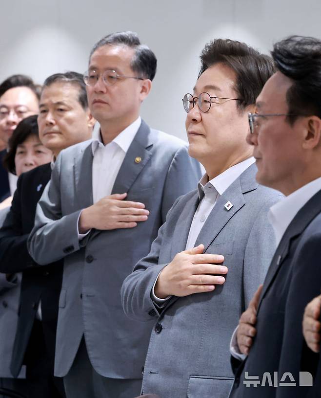 [서울=뉴시스] 최동준 기자 = 이재명 대통령이 15일 서울 용산 대통령실 청사에서 열린 국무회의에서 국민의례를 하고 있다. (대통령실통신사진기자단) 2025.07.15. photocdj@newsis.com