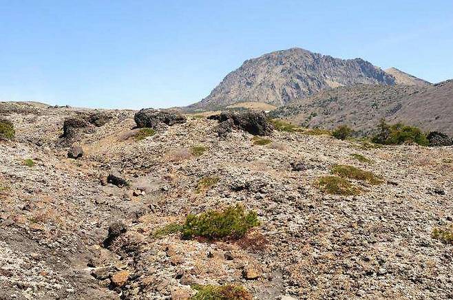 한라산 모세왓 유문암질 각력암 지대는 제주 한라산 백록담 남서쪽 방향 외곽 지역에 크기가 제각각인 유문암질 암석 조각들이 서로 맞물려 넓게 분포하는 구역을 말한다. 사진은 한라산 모세왓 유문암질 각력암 지대 전경. 2025.7.15 [국가유산청 제공. 재판매 및 DB 금지]
