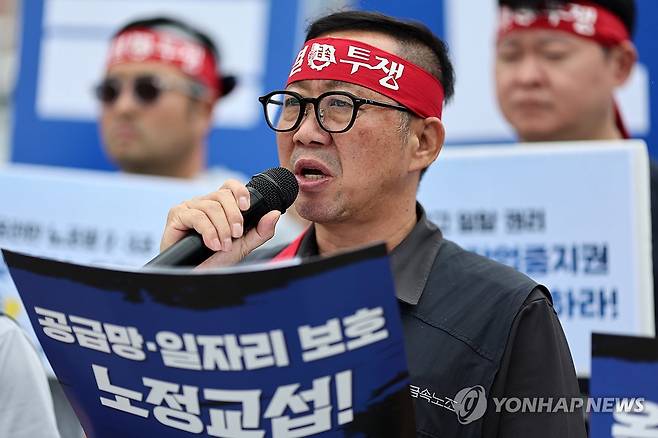 (서울=연합뉴스) 윤동진 기자 = 15일 서울 용산 전쟁기념관 앞에서 '금속노조 7·16 총파업 돌입 선언 기자회견'이 열리고 있다. 2025.7.15