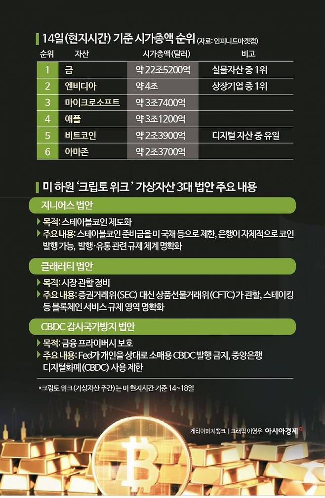 비트코인 가격이 사상 처음으로 12만3000달러를 돌파했다. 미국 의회가 친(親) 가상자산 법안을 집중적으로 논의하는 이른바 '크립토 위크'(crypto week)에 돌입하면서 규제 리스크 해소 기대, 제도권 편입 움직임, 기관 자금 유입 등이 복합적으로 작용한 결과다. 비트코인은 금의 연간 수익률을 제치고 올해 최고의 투자 자산으로 부상했으며, 시가총액 기준 세계 4위 기업인 아마존닷컴을 추월하기도 했다.