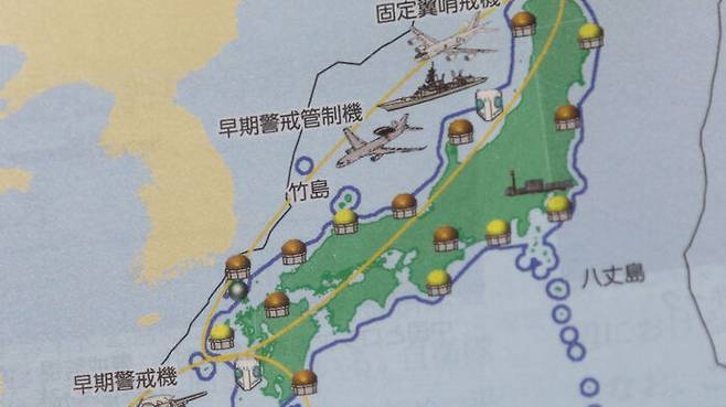 아울러 '우리나라 주변 해·공역에서의 경계·감시' 지도에도 독도 주변을 파란색 실선으로 처리해 자국 영해라는 주장을 부각했습니다. 다른 지도에도 독도에 '다케시마'라는 지명을 기재했습니다.