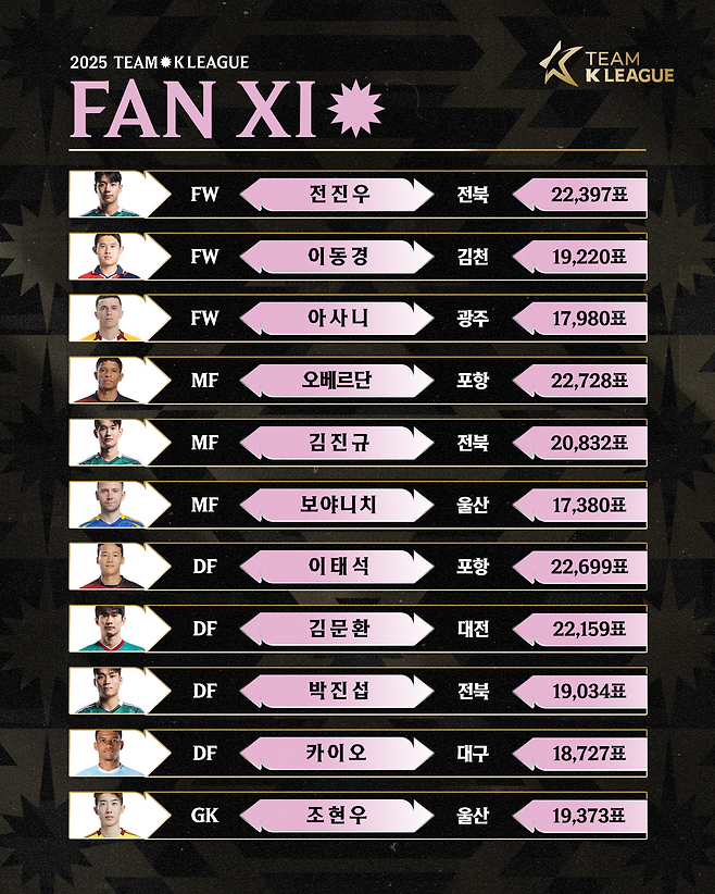 FW: 1위 전진우(전북, 22,397표), 2위 이동경(김천, 19,220표), 3위 아사니(광주, 17,980표)