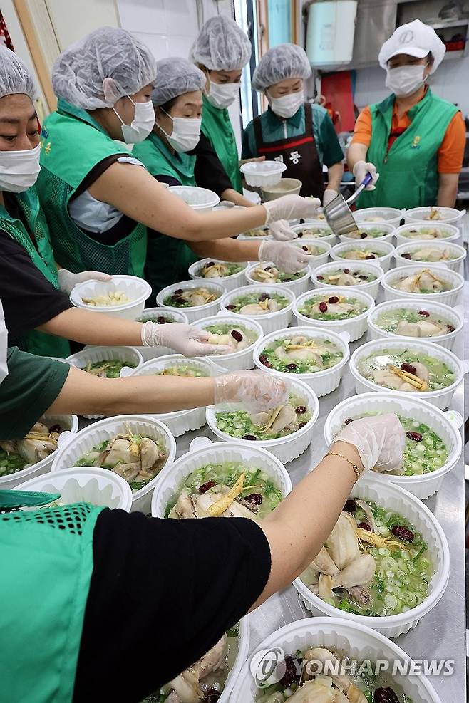 (수원=연합뉴스) 권준우 기자 = 15일 오전 경기도 수원시 권선구 평동행정복지센터에서 평동새마을부녀회 관계자들이 초복을 앞두고 관내 독거 어르신 등 취약계층에 전달할 삼계탕을 만들고 있다. 2025.7.15