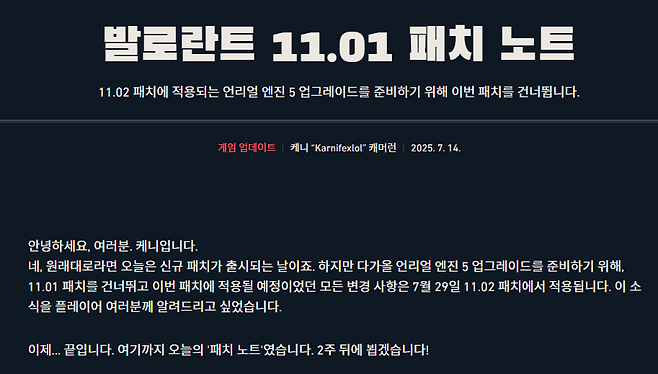 본래 일정대로라면 11.02 패치가 15일 진행되어야 하지만, 이를 건너뛰고 언리얼 엔진5 업그레이드에 집중하겠다는 내용이다.