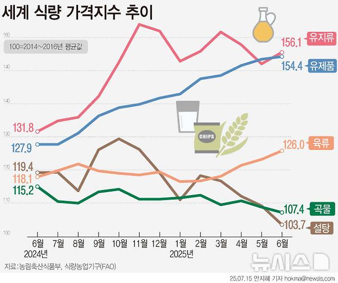 [서울=뉴시스]국제 유지류와 육류, 유제품 가격이 일제히 오르면서 6월 세계식량가격지수가 한 달 새 소폭 상승한 것으로 나타났다. 주요 곡물과 설탕은 하락세를 보였다. FAO는 2025~26년도 세계 곡물 생산량을 전년보다 2.3% 증가한 29억2540만t으로 전망했다. 소비량 역시 0.8% 증가한 29억200만t에 달할 것으로 예상했다.