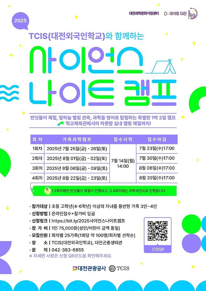 한편 '사이언스 나이트 캠프'는 포스터의 QR코드를 통해 신청할 수 있으며, 자세한 내용은 프로그램 문의처(042-383-6855)로 문의하면 된다.