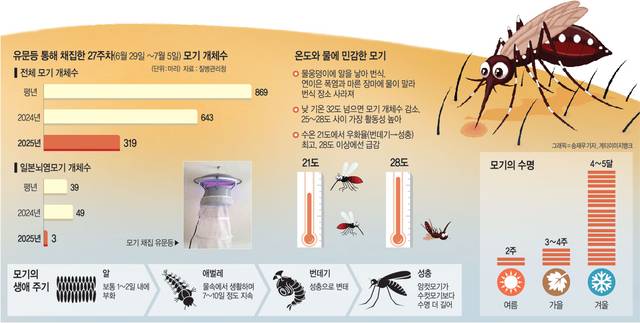 15일 질병관리청에 따르면 올해 27주차(6월 29일∼7월 5일) 전국 14개 지점에서 유문등(誘蚊燈)을 통해 채집한 모기는 총 319마리에 그쳤다. 평년(2022∼2024년 평균) 이 기간엔 869마리가 잡힌다. 지난해 같은 기간 643마리와 비교해도 올해는 모기 수가 대폭 줄었다. 또 같은 기간 일본뇌염 매개 모기 개체 수도 지난해 49마리였던 것이 올해는 3마리만 채집됐다. 방역 전문가들은 최근 무더위로 인해 모기 개체 수가 급감한 것으로 보고 있다. 모기들은 고인 물이나 물웅덩이 등에 산란을 하는데, 폭염에 물이 말라 알을 낳을 곳이 사라졌다는 것이다.