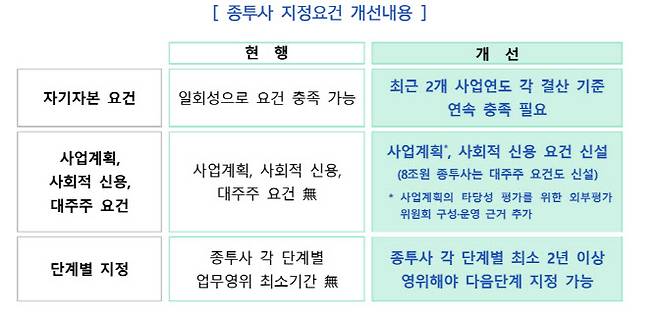 종투사 지정요건도 대폭 강화된다. 자기자본 요건은 신청시점 일회성 충족에서 최근 2개 사업연도 연속 충족으로 바뀌고, 사업계획과 사회적 신용, 대주주 요건이 신설된다. 각 단계별(3조원, 4조원)로 2년 이상 영위해야 다음 단계 지정이 가능하다. 8조원 종투사 지정에는 대주주 요건이 추가된다.