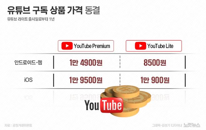 아울러 최근 각종 구독제 상품 가격이 연이어 인상되는 상황을 고려해 가격 유지 방안을 협의한 끝에, 구글이 유튜브 프리미엄의 현재 가격을 유튜브 라이트 출시일로부터 약 1년간 인상하지 않고 동결하는 방안도 이번 잠정 동의의결안에 포함했다.