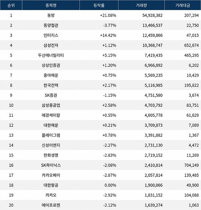 한편 거래량 상위 20위권 종목들은 애경케미칼(161000) ▲0.55%, 대한해운(005880) ▲0.21%, 플레이그램(009810) ▲0.78%, 신성이엔지(011930) ▼2.27%, 한화생명(088350) ▼2.83%, SK하이닉스(000660) ▼2.08%, 카카오페이(377300) ▼2.87%, 대한항공(003490) 보합, 카카오(035720) ▼2.92%, 에이프로젠(007460) ▼2.12% 등의 성적을 기록하고 있다.