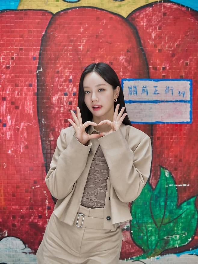 밝은 베이지색 재킷과 팬츠를 매치한 세련된 스타일로, 벽화 앞에서 손으로 하트를 그리며 포즈를 취하고 있다.