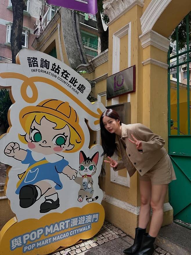 또한, 마카오 시티워크 POP MART 안내판 옆에서 귀여운 포즈를 선보이며 잠시동안의 여행의 즐거움을 드러냈다.