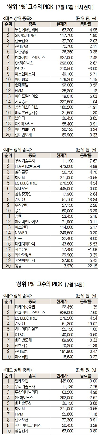 미래에셋증권은 자사 고객 중에서 지난 1개월간 수익률 상위 1% 투자자들의 매매 종목을 집계해 실시간·전일·최근 5일 기준으로 모바일트레이딩시스템(MTS) 상에서 공개하고 있다. 이 통계 데이터는 미래에셋증권의 의견과 무관한 단순 정보 안내이며 각각의 투자자 개인에게 맞는 투자 또는 수익 달성을 보장하지 않는다. 또 테마주 관련 종목은 이상 급등락 가능성이 있으므로 유의해야 한다.