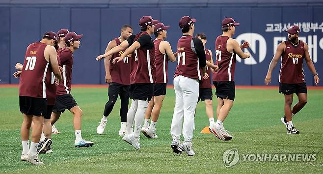 (서울=연합뉴스) 김인철 기자 = 15일 서울 구로구 고척스카이돔에서 키움 히어로즈 선수들이 설종진 감독대행 지휘로 훈련을 하고 있다. 2025.7.15