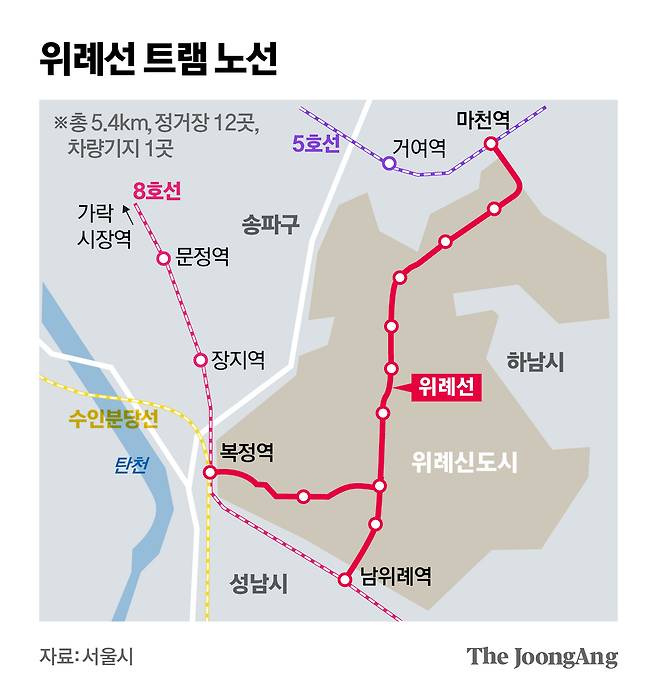 위례트램은 지난 2007년 위례신도시 개발에 따른 교통수요 해결을 위해 국토교통부가 발표한 광역교통개선대책에 처음 포함됐다. 서울 송파구와 경기도 성남시, 하남시로 이뤄진 위례신도시를 남북으로 가로지르는 노선의 길이는 지선을 포함해 5.4㎞다.