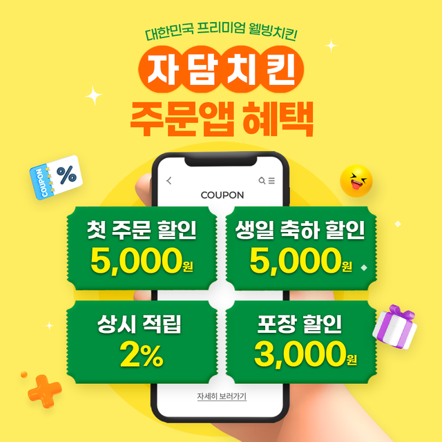 한편, 자담치킨은 이번 리뉴얼을 기념해 다양한 고객 혜택을 제공하고 있다. 리뉴얼 앱에서 첫 주문을 하는 고객에게 5,000원 할인쿠폰을 지급하며, 포장 주문 시에는 상시 3,000원 할인 혜택을 제공한다. 또한, 구매 금액의 2%가 포인트로 자동 적립되어 현금처럼 사용할 수 있다. 기존부터 운영해온 주문 횟수 기반 리워드 제도도 유지되며, 일정 주문 실적을 달성하면 자담치즈볼, 크런치감자스틱, 소떡소떡 등 인기 사이드 메뉴 쿠폰이 무료로 제공된다.