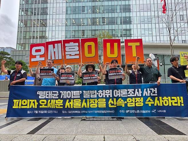 민주노총 서울본부와 너머서울은 15일 오전, 광화문 김건희특검 사무실 앞에서 기자회견을 열고 오 시장에 대한 엄정하고 신속한 수사를 촉구했다.