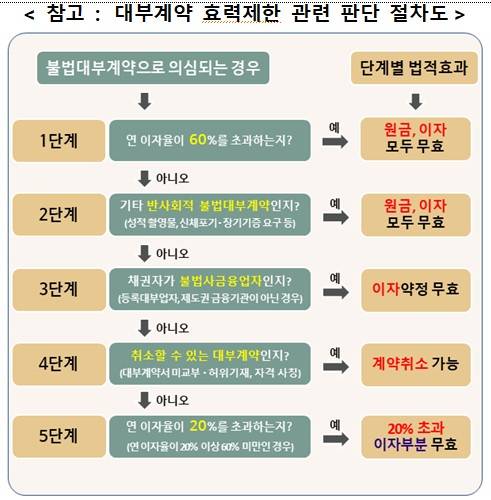 기존에는 최고금리 초과시 초과된 이자만 무효로 규정했지만 22일부터는 이에 더해 성착취·인신매매·신체상해, 폭행·협박·채무자 궁박 등을 이용해 대부이용자에게 현저히 불리하게 체결된 계약, 최고금리(20%)의 3배인 연 60%를 초과하는 초고금리 대부계약 등 반사회적인 불법대부계약은 원금과 이자를 전부 무효로 한다.
