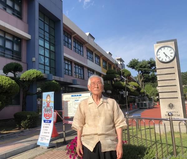 | ▲ 처음으로 징집됐던 경산초등학교 앞에 선 '소년병' 박태승 전 소년병전우회 회장 |