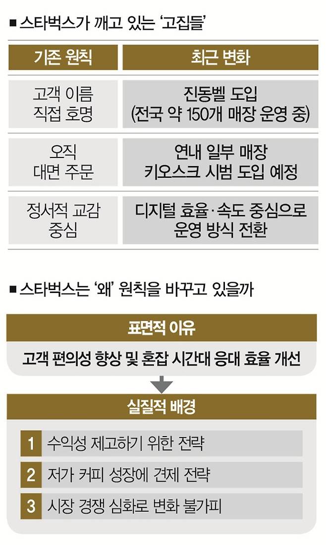문제는 이런 변신이 장기적으로도 괜찮냐는 거다. 스타벅스가 그간 '제3의 공간'으로 자리매김할 수 있었던 건 매장서 느껴지는 정서적 경험 덕분이었다. 따듯한 조명, 편안한 음악, 바리스타의 친절한 응대, 그리고 고객의 이름ㆍ닉네임을 부르며 건네는 음료는 스타벅스만의 차별성이었다. 이런 점에서 진동벨과 키오스크는 '문화를 팔아온' 스타벅스의 정체성과 거리가 멀다.