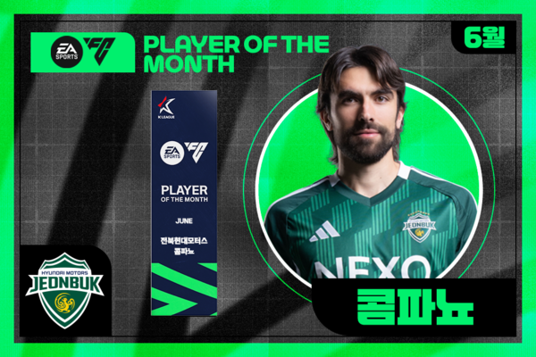 15일 한국프로축구연맹은 "전북현대 콤파뇨가 K리그 공식 비디오게임 파트너 일렉트로닉아츠(Electronic Arts, 'EA')가 후원하는 2025년 6월 'EA SPORTS 이달의선수상(EA SPORTS Player Of The Month)'을 수상했다"라고 발표했다.