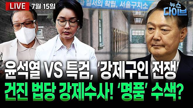 특검, 서울구치소에 경고 '지휘 불이행 땐 책임 묻겠다' / 버티는 윤석열vs특검, 강제구인 대치 / 김건희 특검, 각종 의혹 동시다발 압수수색 / 'VIP 격노설' 변심한 김태효...김용현도 있었다! / 특검 전담팀 가동, 국힘은 여전히 '자중지란' / 강선우, 이진숙 인사청문회 전망은? 오늘 (7월 15일) 뉴스 다이브 많은 시청바랍니다.