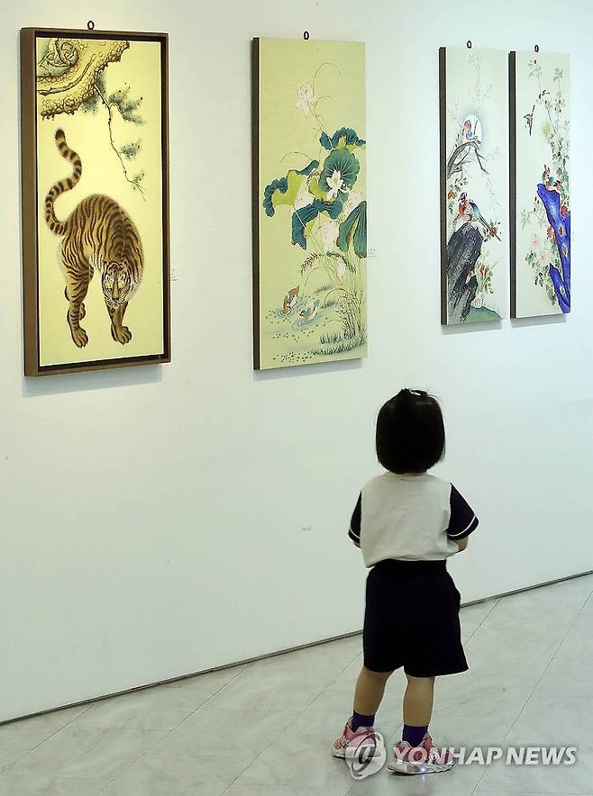(구미=연합뉴스) 김현태 기자 = 15일 경북 구미시 구미예 갤러리에서 한국전통민화연구소 주최로 열린 민화 작품 전시회에서 갤러리를 찾은 어린이가 민화를 살펴보고 있다. 2025.7.15