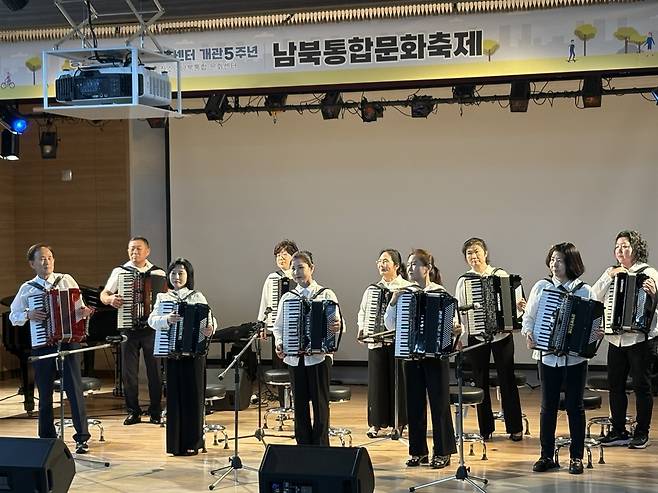 | ▲ 올해 남북통합문화센터 개관 5주년을 기념해 남북주민으로 구성된 아코디언 연주단이 축하연주하고 있는 모습 |