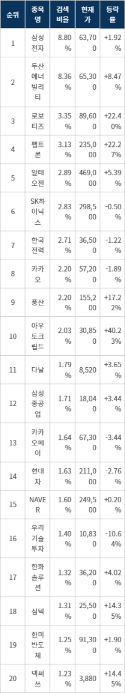 이어 검색비율 2위의 두산에너빌리티(034020)는 상승률 8.47%로 상승 마감했다. 검색비율 3위의 로보티즈(108490)는 22.40% 폭등 마감했다. 검색비율 4위 펩트론(087010)은 22.27%의 폭등세를 보였다. 검색비율 5위 알테오젠(196170)은 5.39% 상승하며 강보합으로 마감했다.