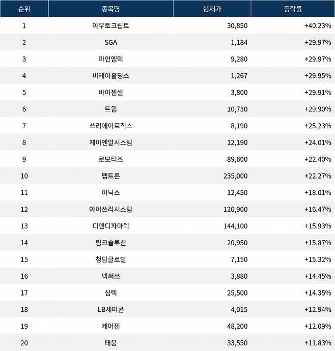 6위 트윔(290090)은 종가 10,730원으로 +29.90% 상승 마감했다. 7위 쓰리에이로직스(177900)는 종가 8,190원으로 +25.23% 상승 마감했다. 8위 케이엔알시스템(199430)은 종가 12,190원으로 +24.01% 상승 마감했다. 9위 로보티즈(108490)는 종가 89,600원으로 +22.40% 상승 마감했다. 10위 펩트론(087010)은 종가 235,000원으로 +22.27% 상승 마감했다.