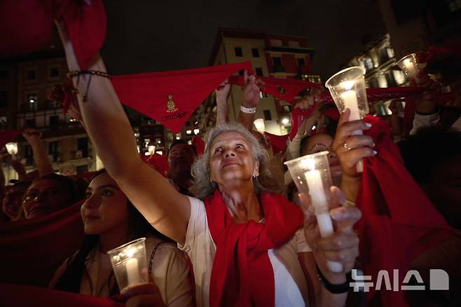 [팜플로나=AP/뉴시스] 15일(현지 시간) 스페인 북부 팜플로나에서 산 페르민 축제 마지막 날을 맞아, 참가자들이 촛불과 붉은 손수건을 들고 폐막노래 '포브레 데 미'(Pobre de Mí)를 부르며 9일간 이어진 축제를 마무리하고 있다. 2025.07.15.