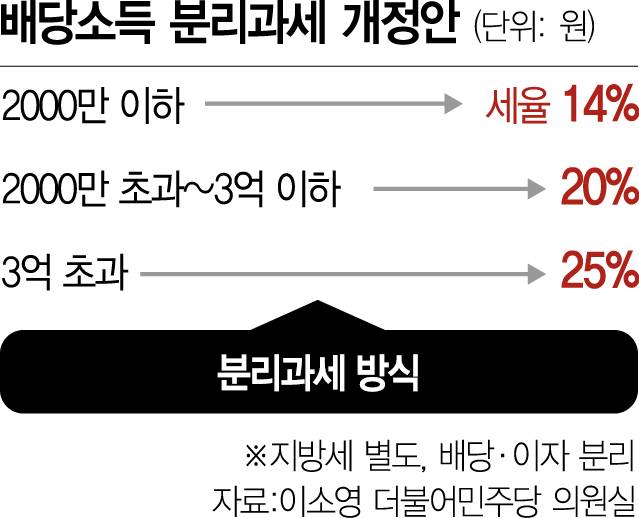 현행 소득세법은 연 2000만 원까지 금융소득(배당+이자)에 14% 세율로 원천징수하지만 2000만 원 초과 시 금융소득종합과세 대상에 포함해 최고 45%의 누진세율을 적용한다. 반면 이소영 의원안은 배당소득이 연 2000만 원 이상 3억 원 이하의 경우 20%, 3억 원 초과 시 최고세율 25%가 적용된다. 종합소득세와 배당소득세의 최고세율 간 격차가 20%포인트나 되는 것이다.