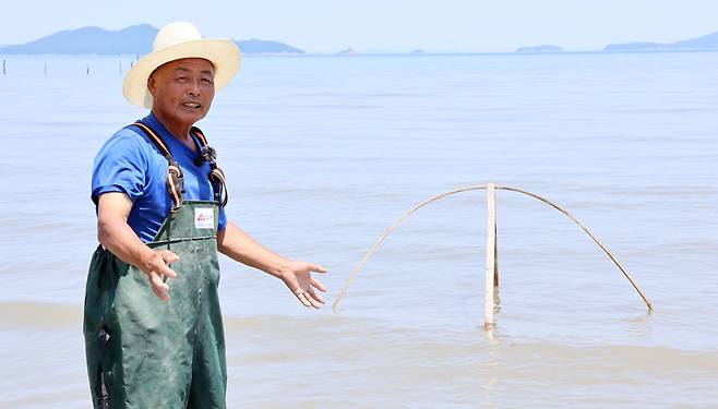 2025년 7월 11일 오전 11시쯤, 인천 옹진군 문갑도에서 김훈기 어촌계장을 만났다. 그는 직접 사닥 틀을 만들고, 물속으로 들어가 시연까지 해 보였다.