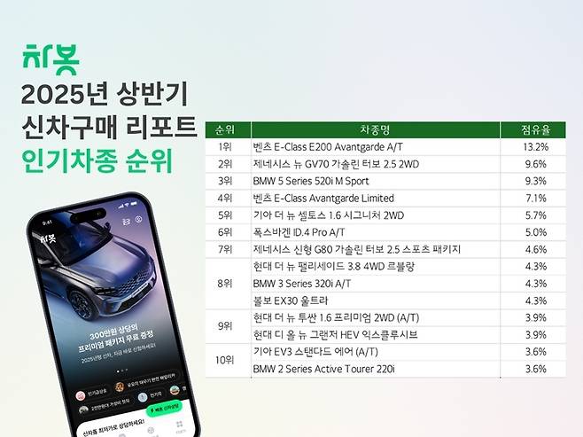 모빌리티 컨시어지 플랫폼 컴퍼니 차봇모빌리티(대표 강성근)가 2025년 상반기 운전자 통합 플랫폼 ‘차봇’의 '내 차 구매 서비스 이용 고객’ 데이터를 분석한 신차 인기 차종 순위 및 시장 트렌드를 14일 발표했다.
