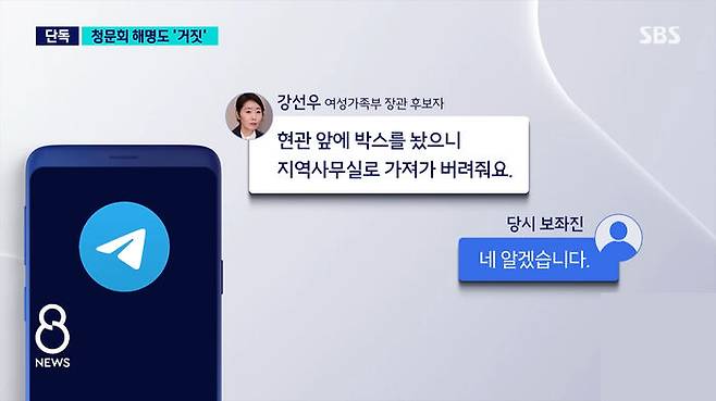 그러나 어젯밤 SBS 8뉴스는 강 후보자의 해명이 거짓이라는 증거를 조목조목 제시했습니다. 강 후보자는 당초 보좌진이 쓰레기를 치운 건 맞지만 직접 지시한 것은 아니라는 취지로 해명했는데, 두 사람이 주고 받은 텔레그램 메시지는 이와 달랐습니다. 강 후보자가 자신의 집으로 보좌진을 부르면서 "현관 앞에 박스를 내놨으니 지역구 사무실 건물로 가져가 버리라"고 쓰여 있습니다.