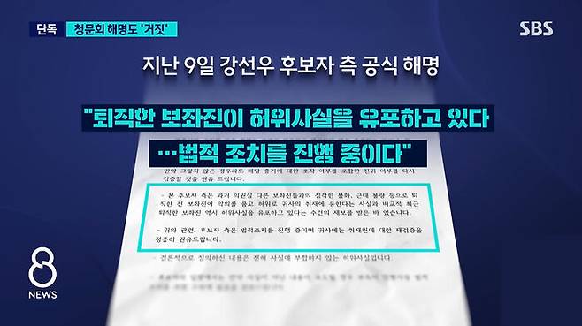 그러나 강 후보자는 지난 9일 SBS에 보낸 공식 답변서에서 "퇴직한 보좌진이 허위사실을 유포하고 있다"며 "법적 조치를 진행 중"이라고 밝힌 바 있습니다.