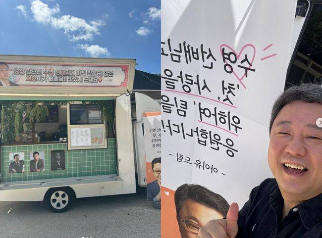 공개된 사진 속에는 아이유가 보낸 커피차가 담겨 있다. 커피차에는 “요정 같으신 수영 선배님께, 아직 갚을 게 많은 지안이가 쏩니다! 맛있게 드세요. - 지안”이라는 문구가 붙어 있어 훈훈함을 더했다.