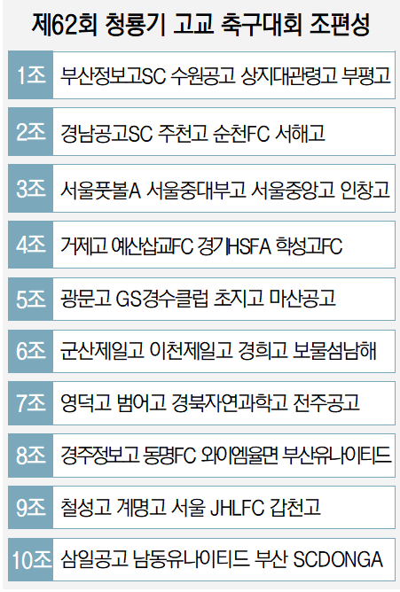 한편 15일 부산일보사에서 제62회 청룡기 전국중학교축구대회 조 추첨도 완료돼 대진이 최종 확정됐다. 중등부 경기는 8월 2일부터 15일까지 14일간 같은 장소에서 개최된다.