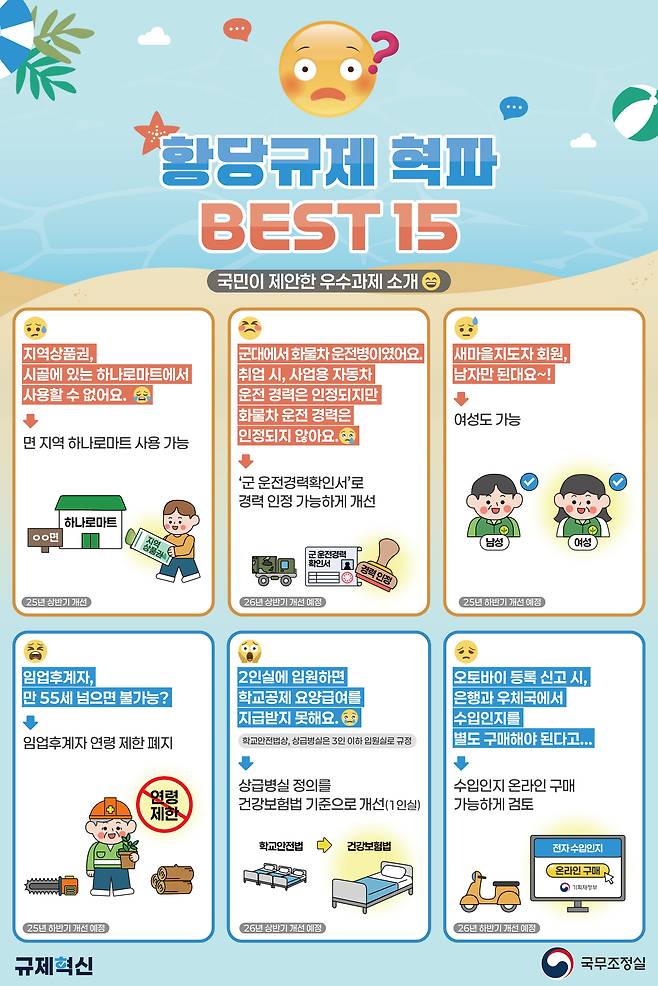 고령화 시대를 역행하는 '임업후계자 연령 제한', '군 운전병의 화물차 운전 경력을 인정하지 않는 규정' 등도 국민의 실생활과 괴리가 있는 대표적 규제로 꼽힙니다.