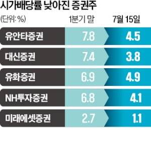 NH투자증권(6.8%→4.1%)과 미래에셋증권(2.7%→1.1%)의 시가배당률도 크게 하락했다. 그동안 증권주는 낮은 주가 변동성과 뛰어난 시가배당률을 갖춰 주로 배당 투자자가 선호하는 종목이었다. 배당 매력 약화는 이 같은 투자자의 외면을 부를 수 있다.