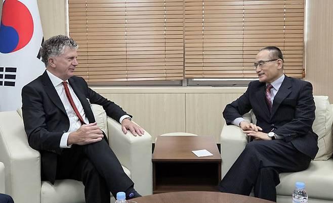 [서울=뉴시스] 위성락 국가안보실장이 15일 서울 용산 대통령실에서 방한 중인 조너선 파월 영국 국가안보보좌관과 면담을 하고 있다. (사진=대통령실 제공) 2025.07.15. photo@newsis.com *재판매 및 DB 금지