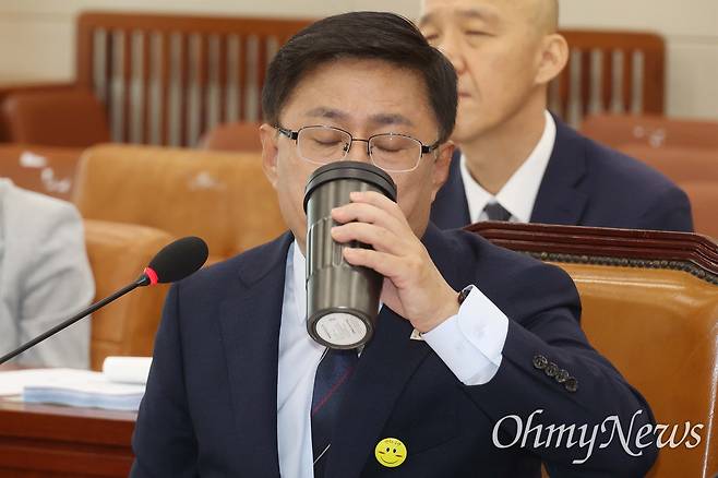 | ▲ 김성환 환경부 장관 후보자가 15일 오전 서울 여의도 국회 환경노동위원회 전체회의에서 열린 인사청문회에 출석해 의원들의 질의에 답변한 뒤 물을 마시고 있다. |
