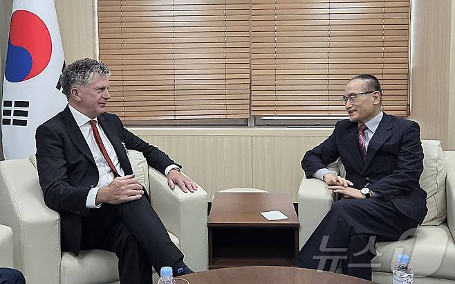 (서울=뉴스1) 이재명 기자 = 위성락 국가안보실장이 15일 서울 용산 대통령실 청사에서 조너선 파월 영국 국가안보보좌관과 면담하고 있다. (대통령실 제공. 재판매 및 DB 금지) 2025.7.15/뉴스1