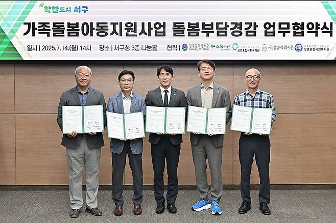 초록우산 광주지역본부는 지난 14일 오후 광주 서구청 나눔홀에서 변정근 초록우산 광주본부장, 김이강 서구청장, 금호·시영·쌍촌종합사회복지관 대표 등이 참석한 가운데 ‘광주 온(ON)돌봄’ 사업 업무 협약을 체결했다. 이번 협약은 민·관 협력체계를 구축, 가족 돌봄 부담으로 어려움을 겪는 이들을 지원하고 돌봄 사각지대를 찾아 해소하기 위해 마련됐다.