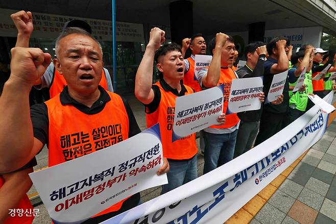 한국발전산업노동조합 조합원들이 15일 서울 중구 서울지방고용노동청 앞에서 해고자 복직을 촉구하는 구호를 외치고 있다.